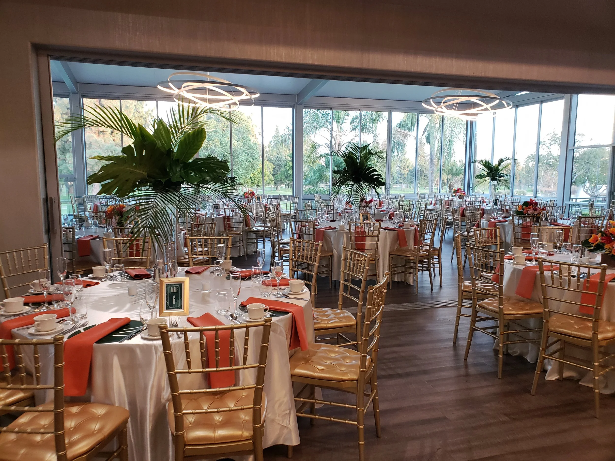 Featuring a built in dance floor with impressive musical & lighting capabilities, Palm Court is an upbeat banquet room featuring seating for up to 250 guests with beautiful fold-out windows that open to the golf course. A built-in DJ booth and a built-in fully stocked bar combine to create a memorable ambiance.